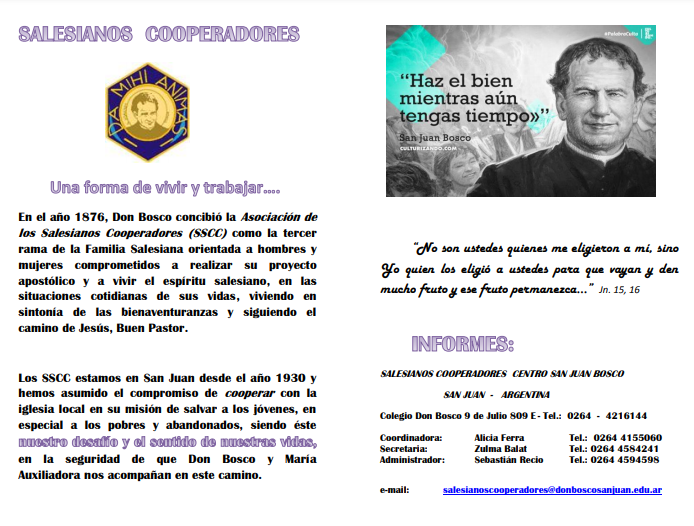El pasado 28 de agosto de 2021, se realizó en el Colegio Don Bosco de San Juan, la Jornada de Presentación Vocacional de la Asociación de los Salesianos Cooperadores (SSCC). Esta es es una pequeña reseña de nuestra identidad.